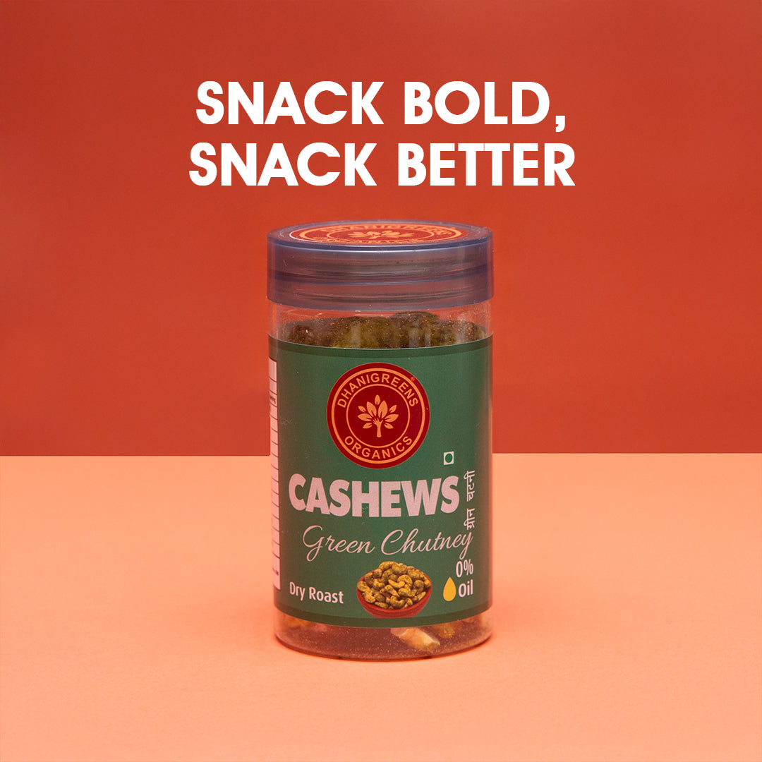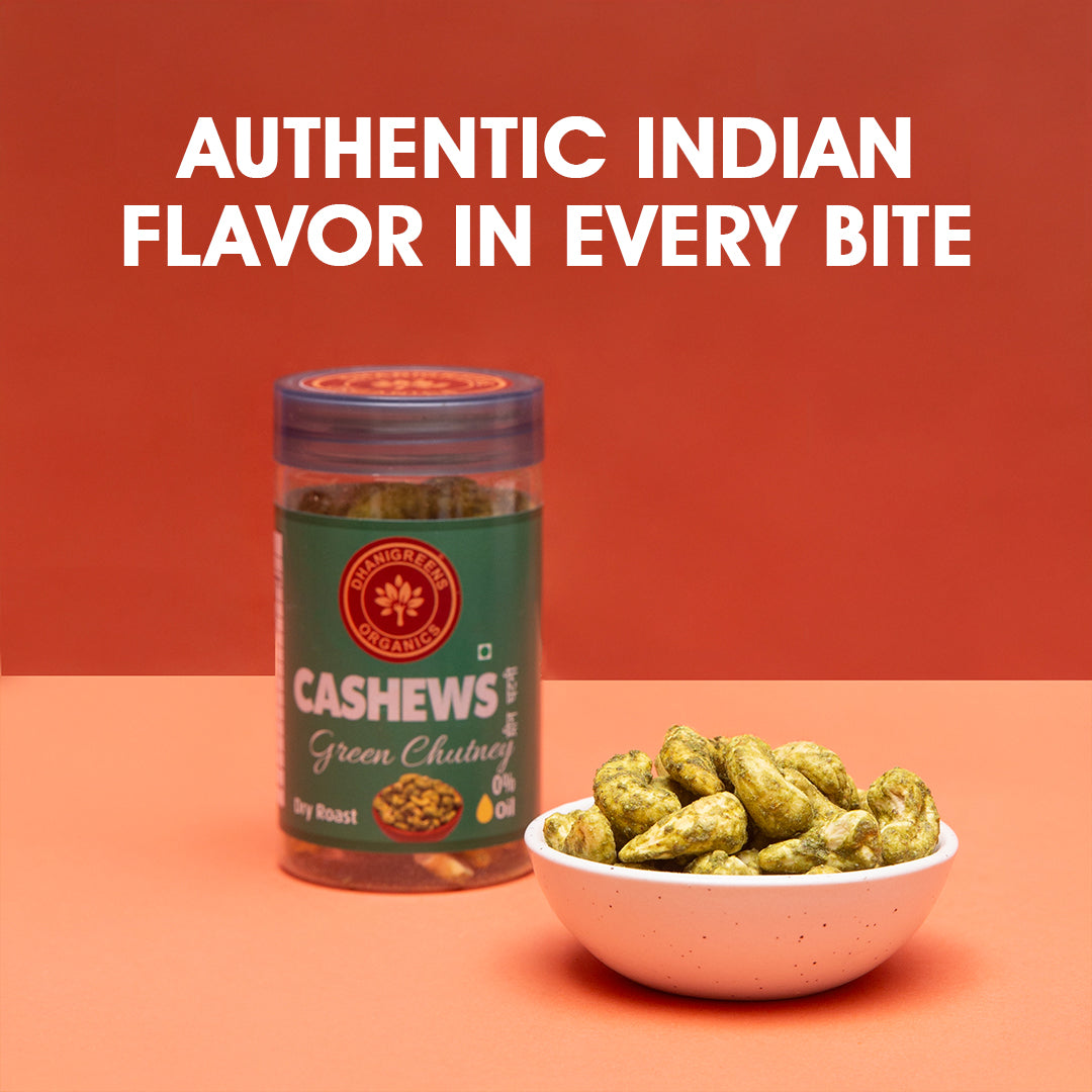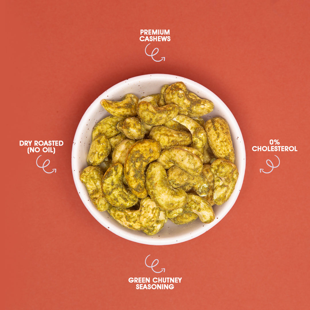 As an expert in the cashew industry, I present to you our GREEN CHUTNEY CASHEWS. Made with a unique dry roasting technique, these nuts are free of oil and gluten, making them a healthy and vegan-friendly option. Enjoy the flavorful benefits of green chutney with every bite.