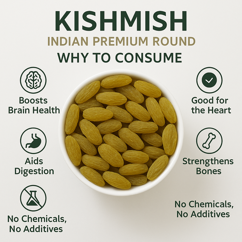 Our Premium Kishmish is naturally sun-dried, seedless, round in shape, and extra sweet! Sourced from the best farms of India, these golden-green gems are full of flavor and health.