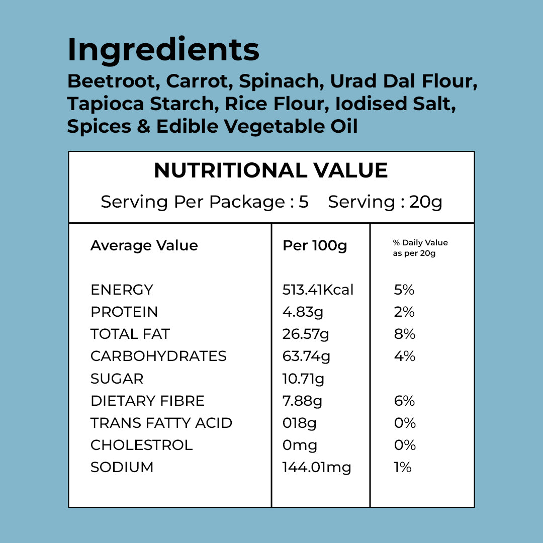 Perfect for clean eating and packed with natural flavour, these gluten-free chips are loaded with fiber, vitamins, and minerals from real vegetables like carrot, spinach, beetroot, and more.