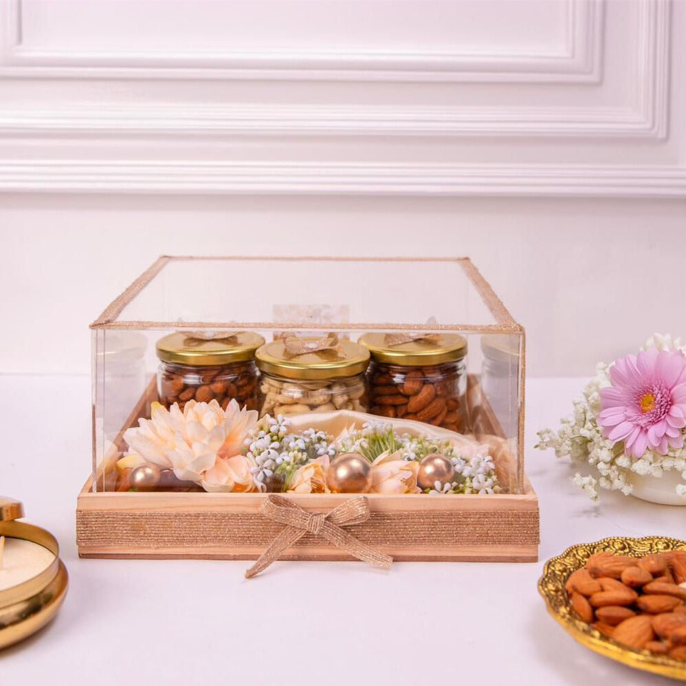 Delight in the rich flavors of this expertly curated Nuts Hamper, featuring three jars filled with premium almonds, cashews, and raisins. Each jar is thoughtfully packed to preserve freshness and presented beautifully, making it an ideal gift for any occasion. This hamper combines wholesome ingredients and elegant packaging to offer a nutritious and impressive present.