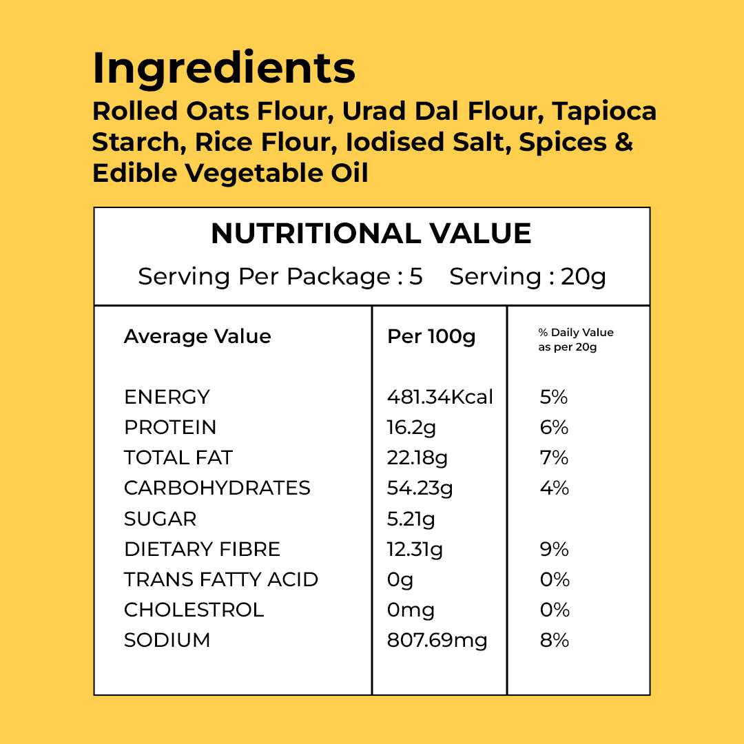 Snack smarter with our delicious Oats Chips, made from a nourishing blend of millet and oats! These crunchy chips are baked, not fried, delivering that satisfying crunch without the added oil.