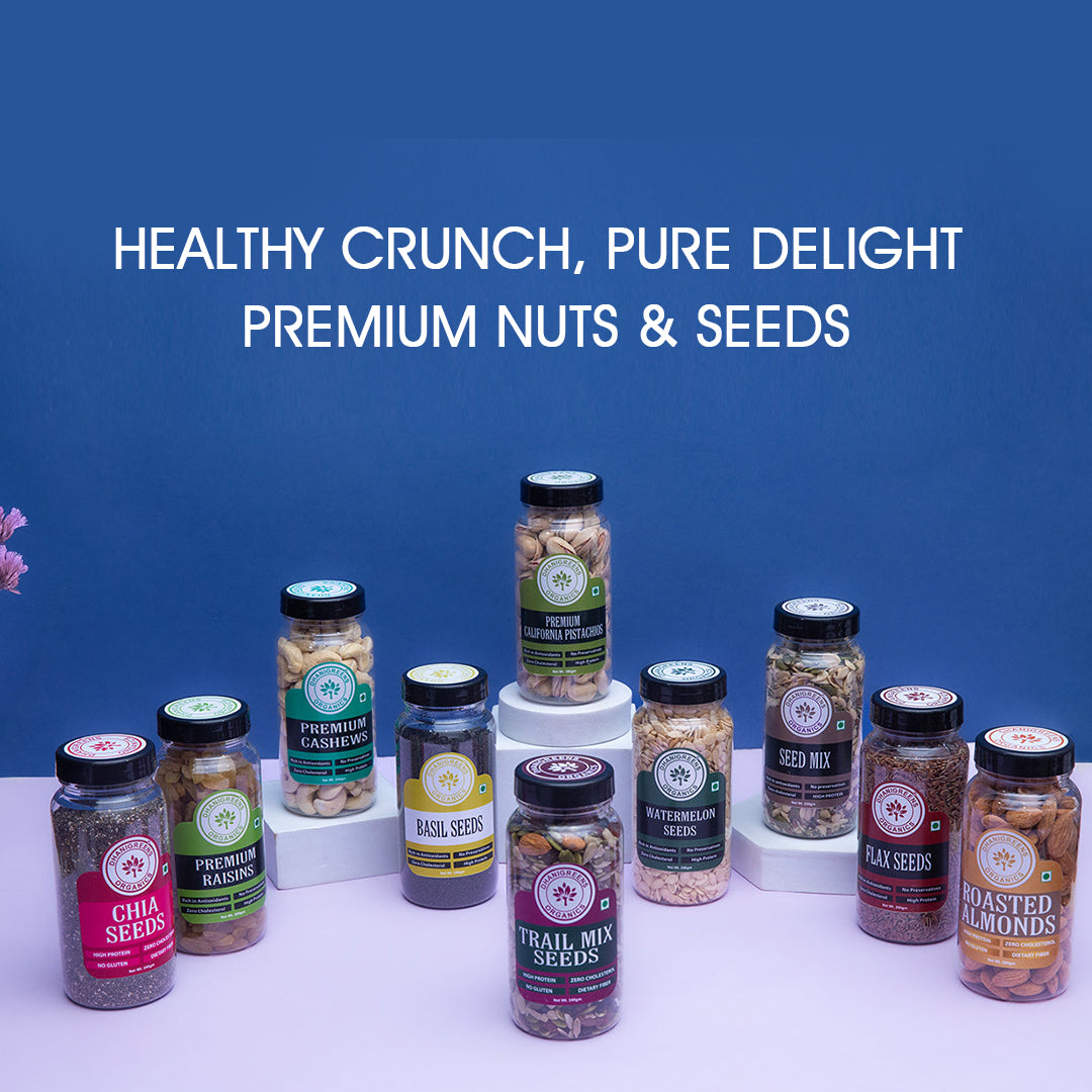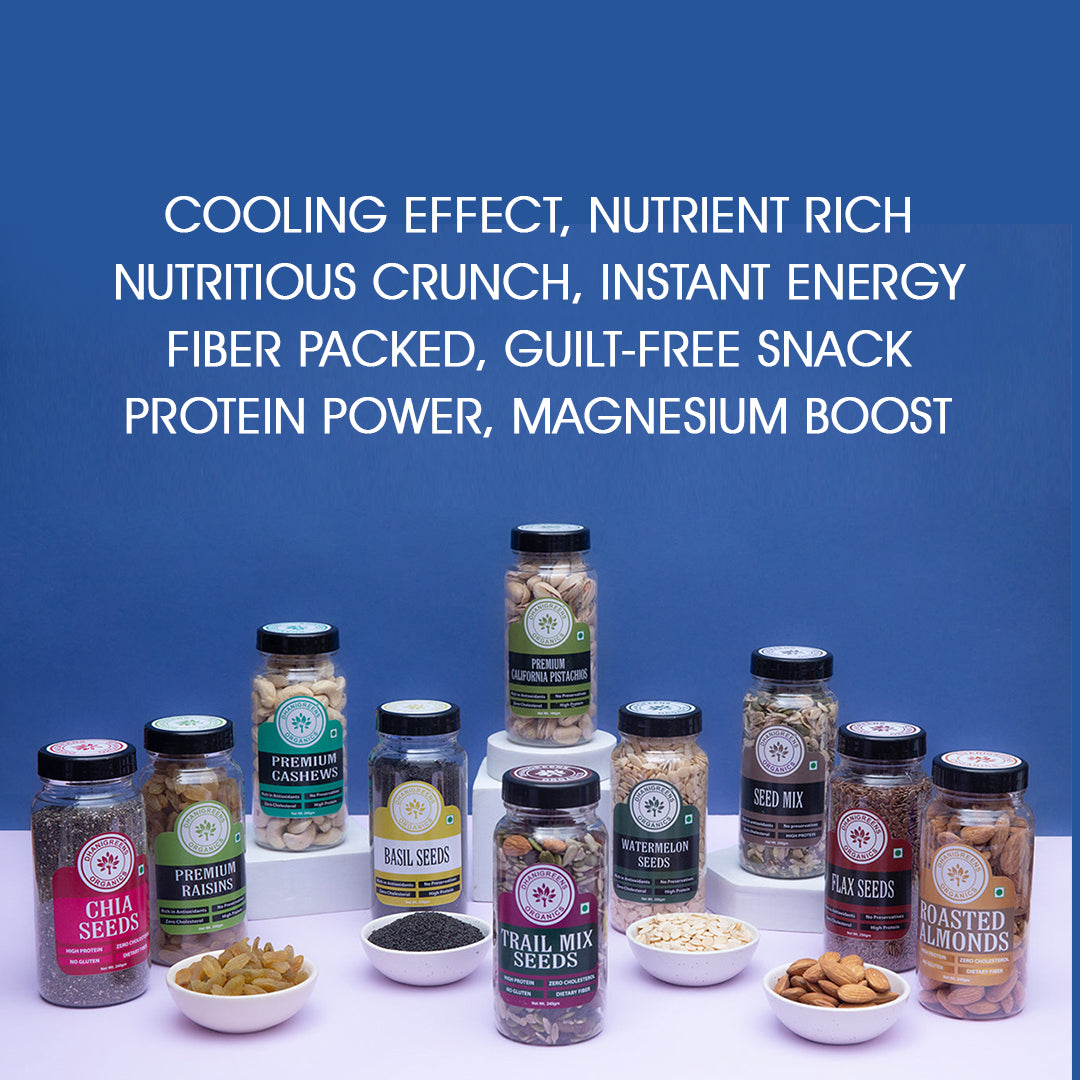 Get your daily dose of essential nutrients with our PACK OF 10 ALMONDS,CASHEW,PISTACHIOS,RAISINS,TRAIL MIX,BASIL SEEDS, FLAX SEEDS,SEEDMIX,CHIA SEEDS, and WATERMELON SEEDS. Satisfy your hunger, boost your energy, and support a healthy lifestyle. Each pack contains a variety of delicious and nutritious options, perfect for on-the-go snacking.