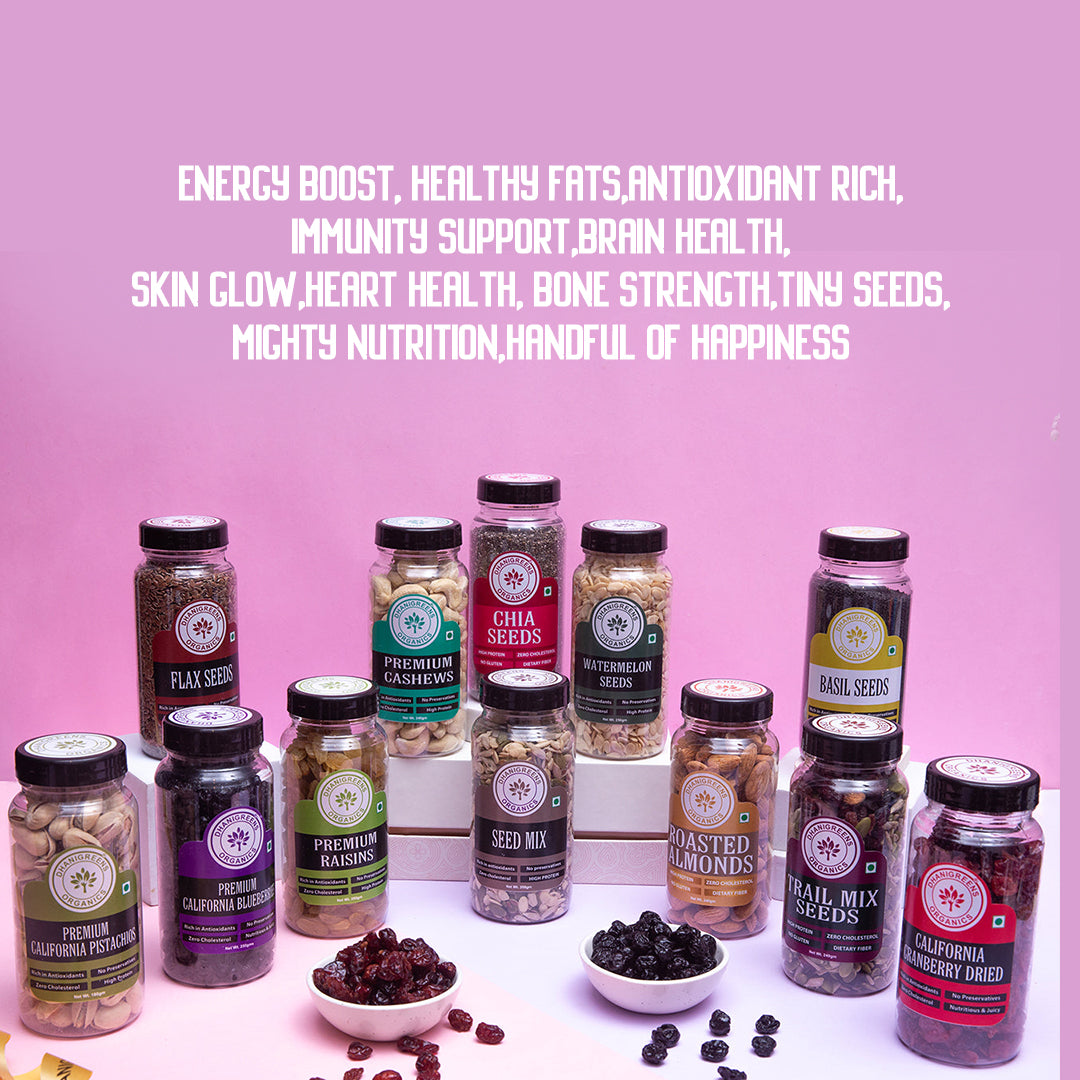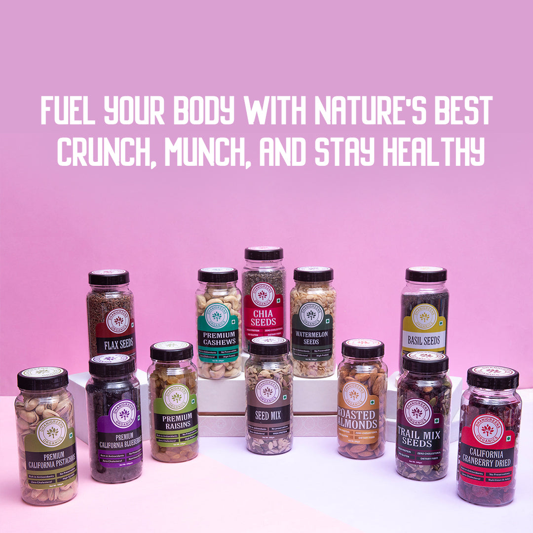 Boost your health with our Pack of 12 Almonds, Cashews, Pistachios, Raisins, Blueberries, Cranberries, Trail Mix, Basil Seeds, Flax Seeds, Seed Mix, Chia Seeds, and Watermelon Seeds. Enjoy a variety of nutrient-rich snacks packed with healthy fats, protein, vitamins, and minerals. A convenient and delicious way to nourish your body.