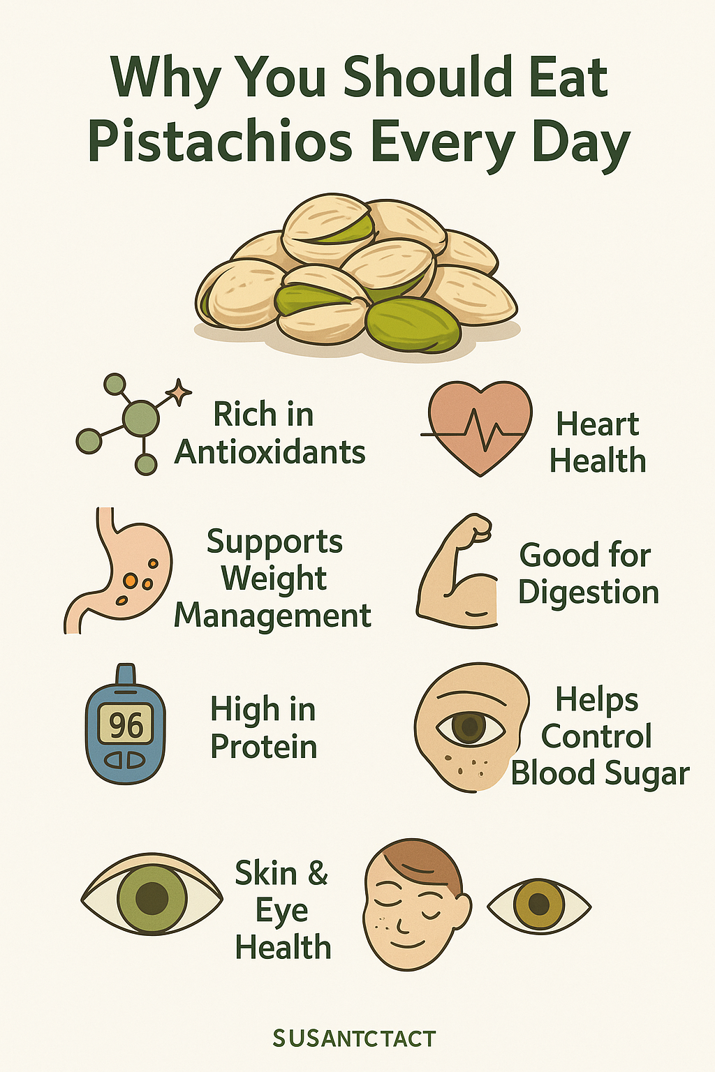 Pistachios are among the most antioxidant-rich nuts. They contain lutein and zeaxanthin — essential for eye health and protection from age-related macular degeneration (Times of India).