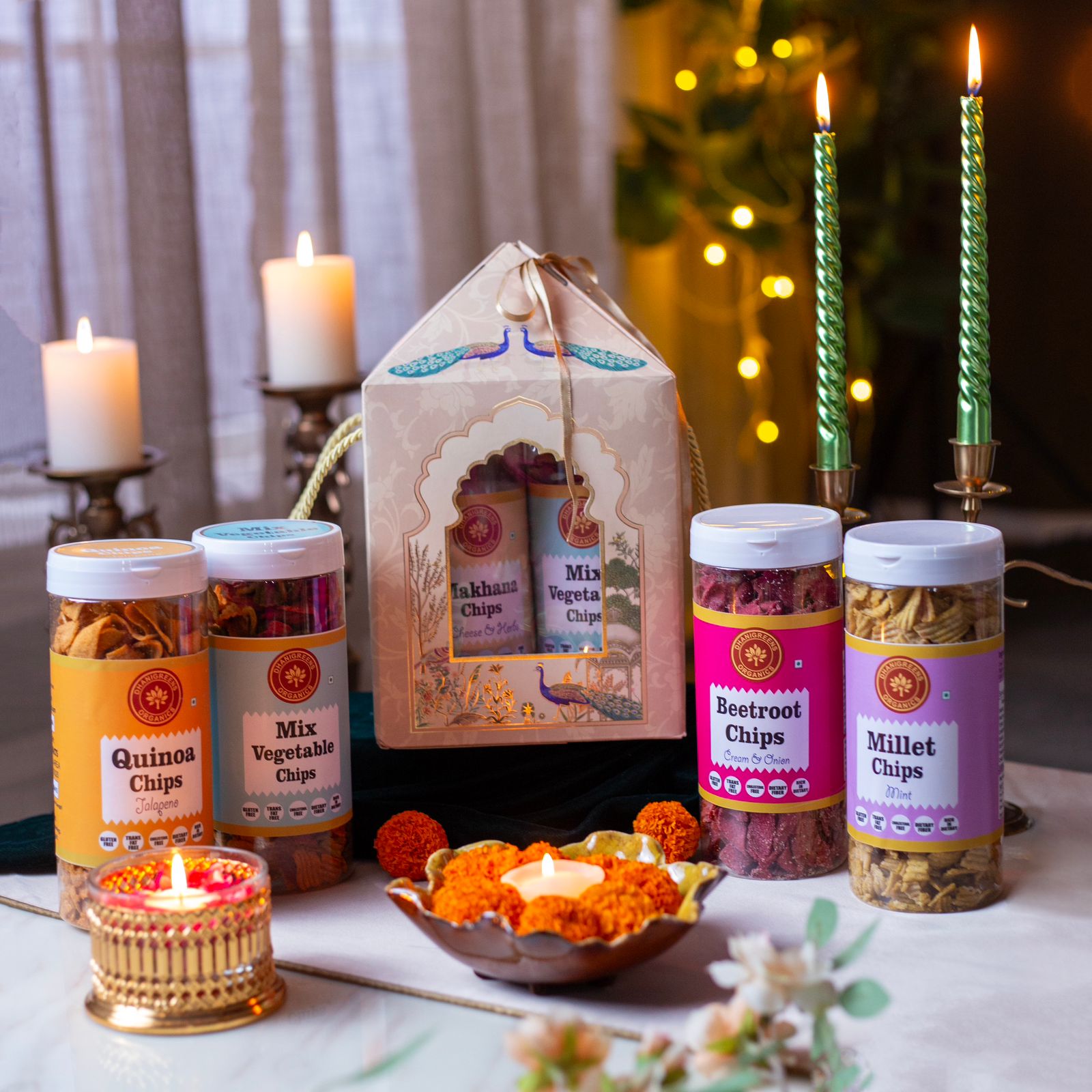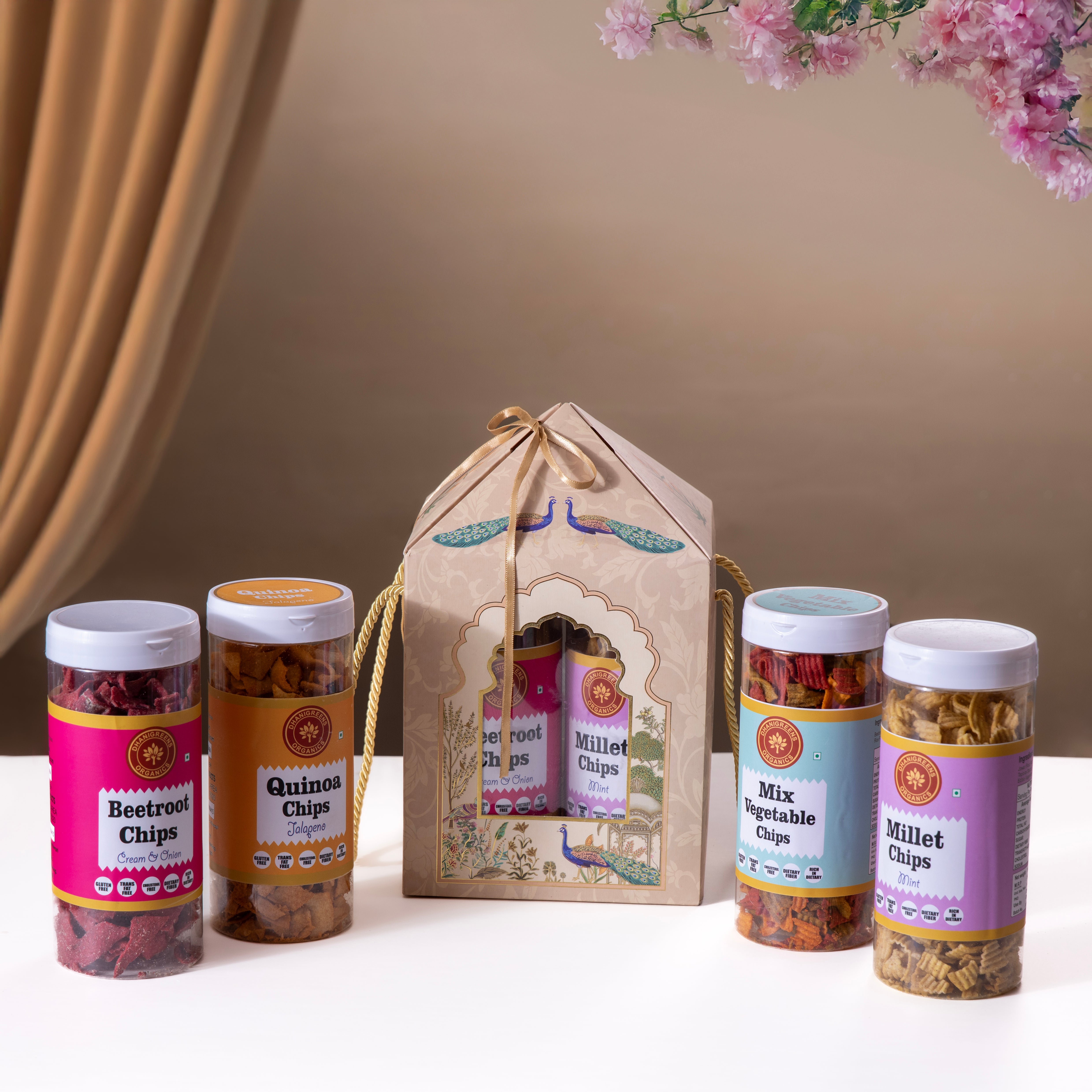 Indulge in a premium snacking experience with our hamper. Packed with delicious options such as beetroot, millet, oats, and corn chips, you can satisfy your cravings guilt-free. These healthy and flavorful snacks are perfect for any occasion and provide essential nutrients for a well-balanced diet. Order now and elevate your snacking game.