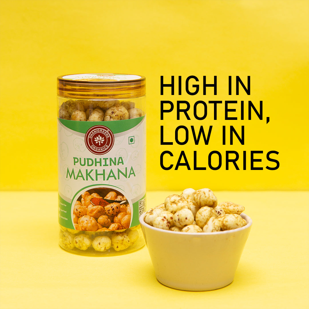 Introducing Dhanigreens Makhana, the ultimate snack for a balanced and nutritious diet. Infused with the refreshing flavours of handpicked Pudhina, these crunchy makhanas are packed with high protein and fibre, making them perfect for guilt-free snacking. Replace unhealthy snacks with this superfood and enjoy a burst of taste and health benefits.